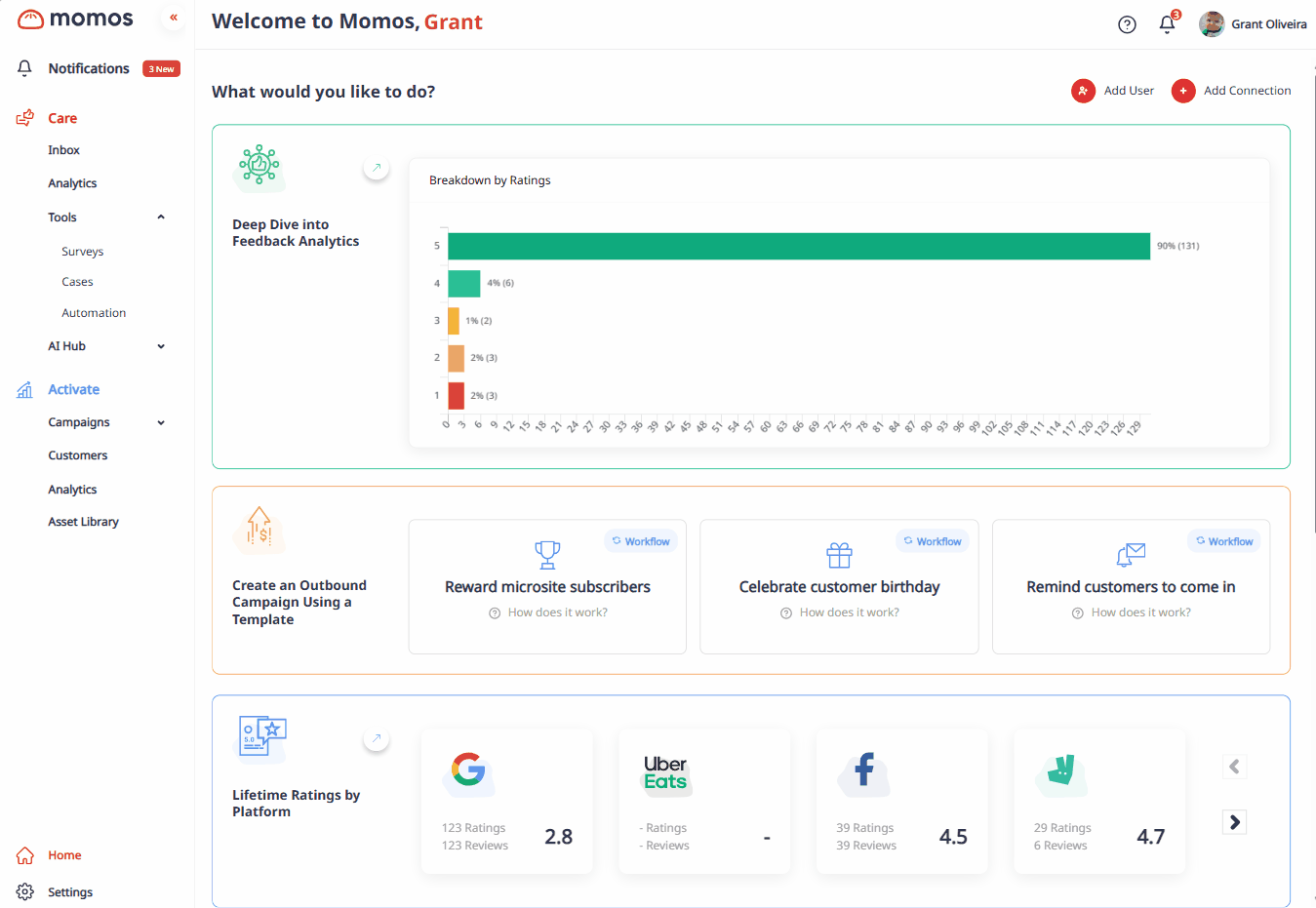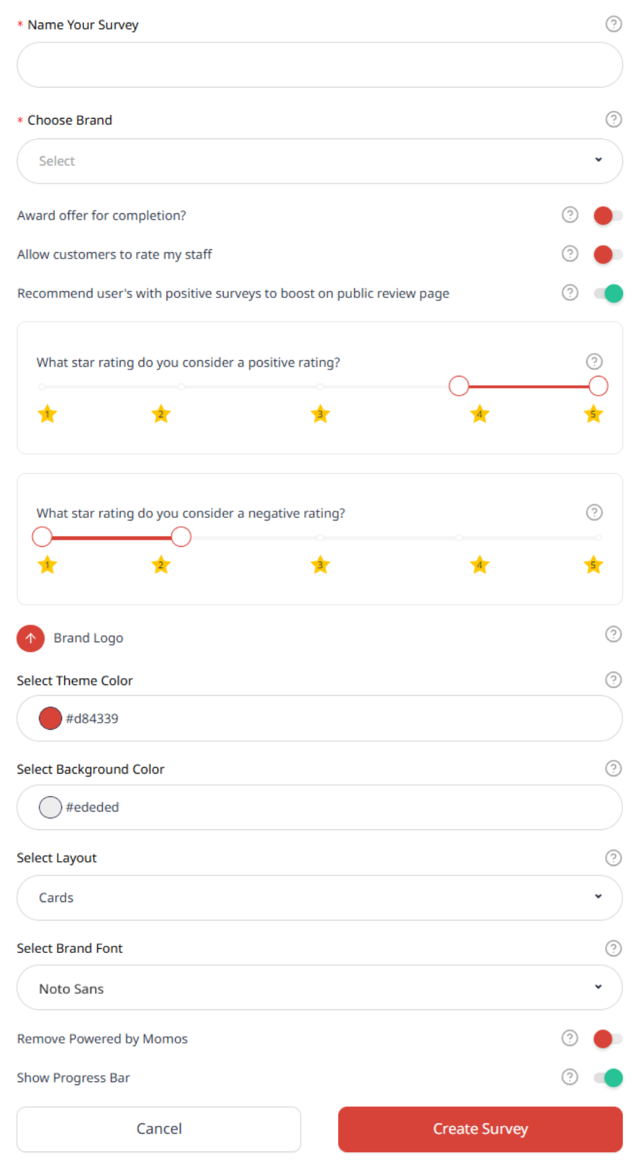 ![]() | Name your surveyThe survey name is for internal use only. It helps you manage the survey and view analytics. Customers won’t see it. Choose brandSelect the correct brand so your survey is tracked and organized properly. Award offer for completionEnable this to send customers a reward after completing the survey. You may choose existing vouchers, create new ones, or offer multiple options. Allow customers to rate staffGather feedback on staff performance, from excellent service to areas needing improvement. Enable boosting on public review pageBoosting encourages customers with positive experiences to leave a public review. The boosting screen shows when a positive rating is given. Positive star ratingDefine what rating counts as “positive” to control question visibility and when boosting appears. All star and emoji scales are normalized to 5 points. Negative star ratingDefine what counts as a negative rating to customize follow-up questions. All rating types are normalized to a 5-point scale. Upload logoYour uploaded logo appears on the Welcome, Personal Information, and Thank You pages. Theme colorThis color is used across key survey elements such as the progress bar and page buttons. Brand fontThe selected font applies across the entire survey, including headings and body text. Powered by MomosShows the “Powered by Momos” badge on the Welcome and Thank You pages. You can toggle this on or off. Show progress barHelps users track their progress and can improve survey completion rates. Select layoutChoose between the Default or Cards layout. More layouts are coming soon. |