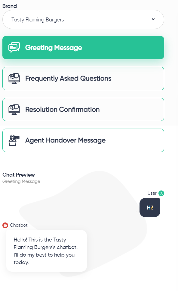 A preview is available for each of the four sections that the Chatbot can be customised for.