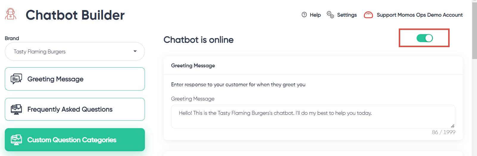 The "Custom Question Categories" lets you train the Momos Chatbot to answer specific questions related to your brand!